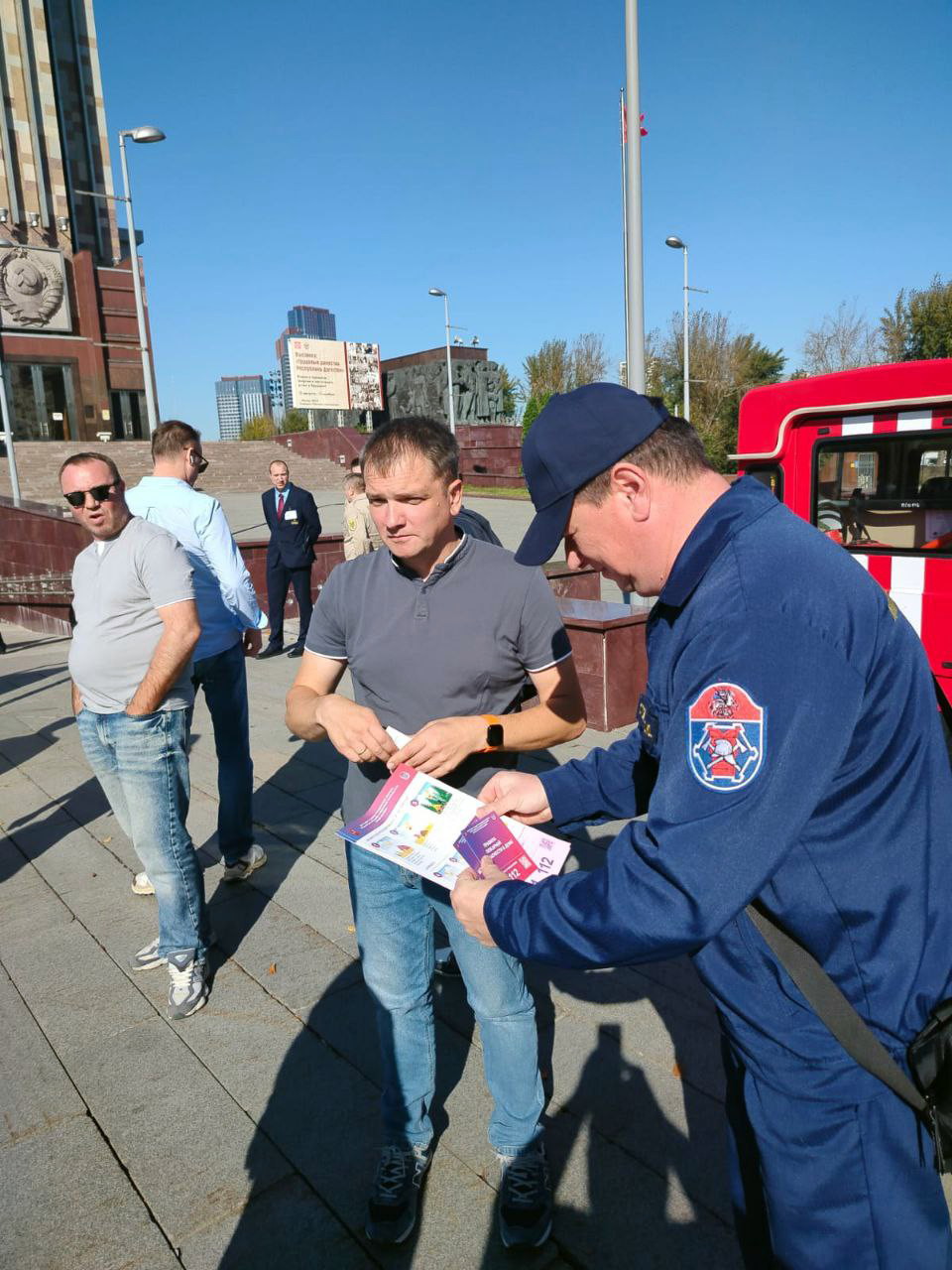 Работники пожарно-спасательного отряда № 216 Пожарно-спасательного центра г. Москвы провели сегодня плановую эвакуацию из музейно-выставочного центра «Рабочий и колхозница». На таких занятиях специалисты отряда учат людей адекватно оценивать грозящую опасность, как быстро покинуть помещение, спасти себя и посетителей павильона.